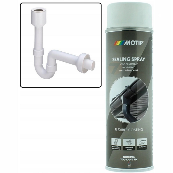 MOTIP  sprej (GUMA) za zaptivanje je fleksibilan premaz koji se lako koristi za zaptivanje i popunjavanje malih curenja i pukotina. Održava svoju fleksibilnost čak i pri promenama temperature i pogodan je za upotrebu na različitim podlogama, kao što su metal, plastika, PVC, beton i vinil. Sprej za zaptivanje se može koristiti u zatvorenom i na otvorenom i stoga je idealan za zaptivanje malih curenja i pukotina na olucima, ventilacijama, odvodima i slično. MOTIP zaptivni sprej je otporan na vremenske uslove, UV otporan i može se prefarbati različitim sistemima boja.